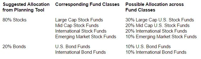 For example, suppose the Vanguard Investment Planning tool suggested an allocation of 80% stocks and 20% bonds. Depending on the funds classes available in your 401(k), you could arrange your portfolio in this way:
